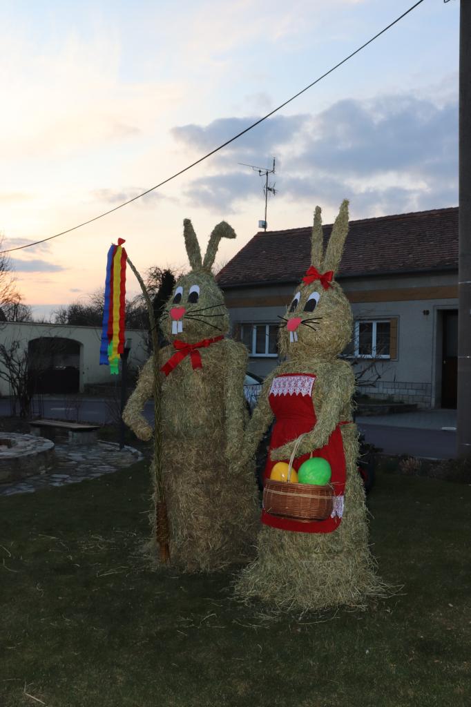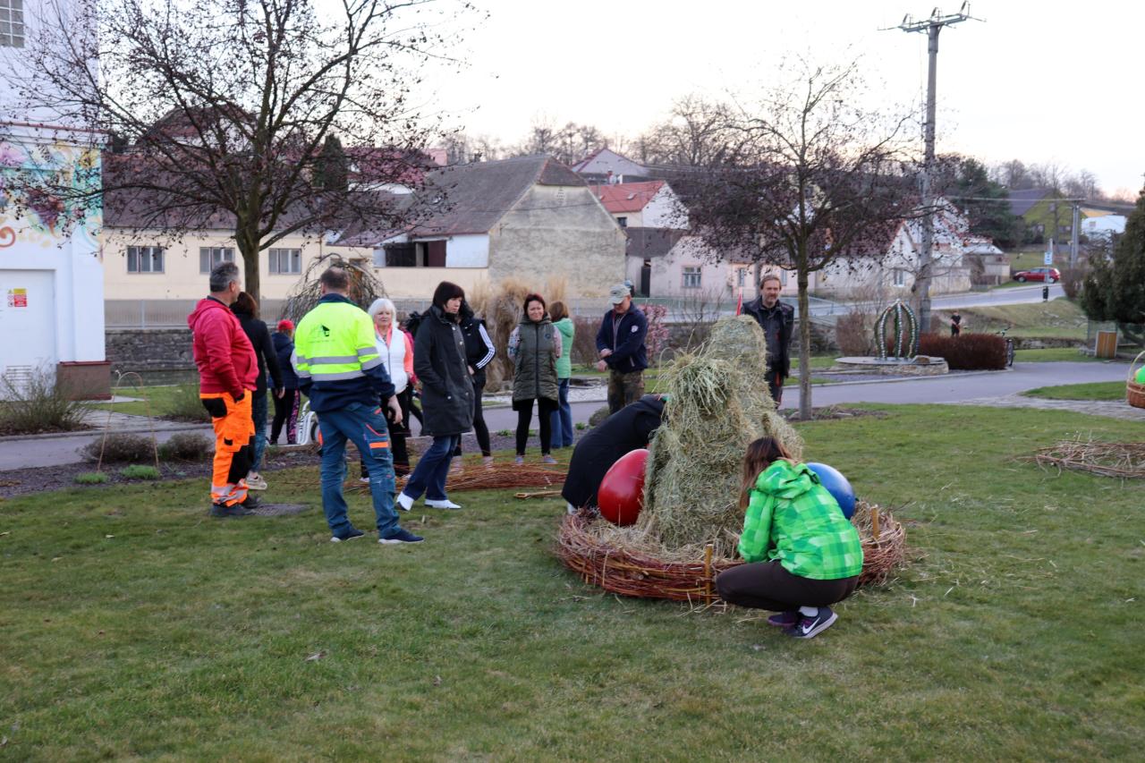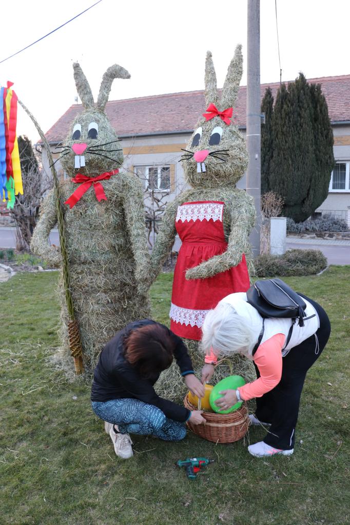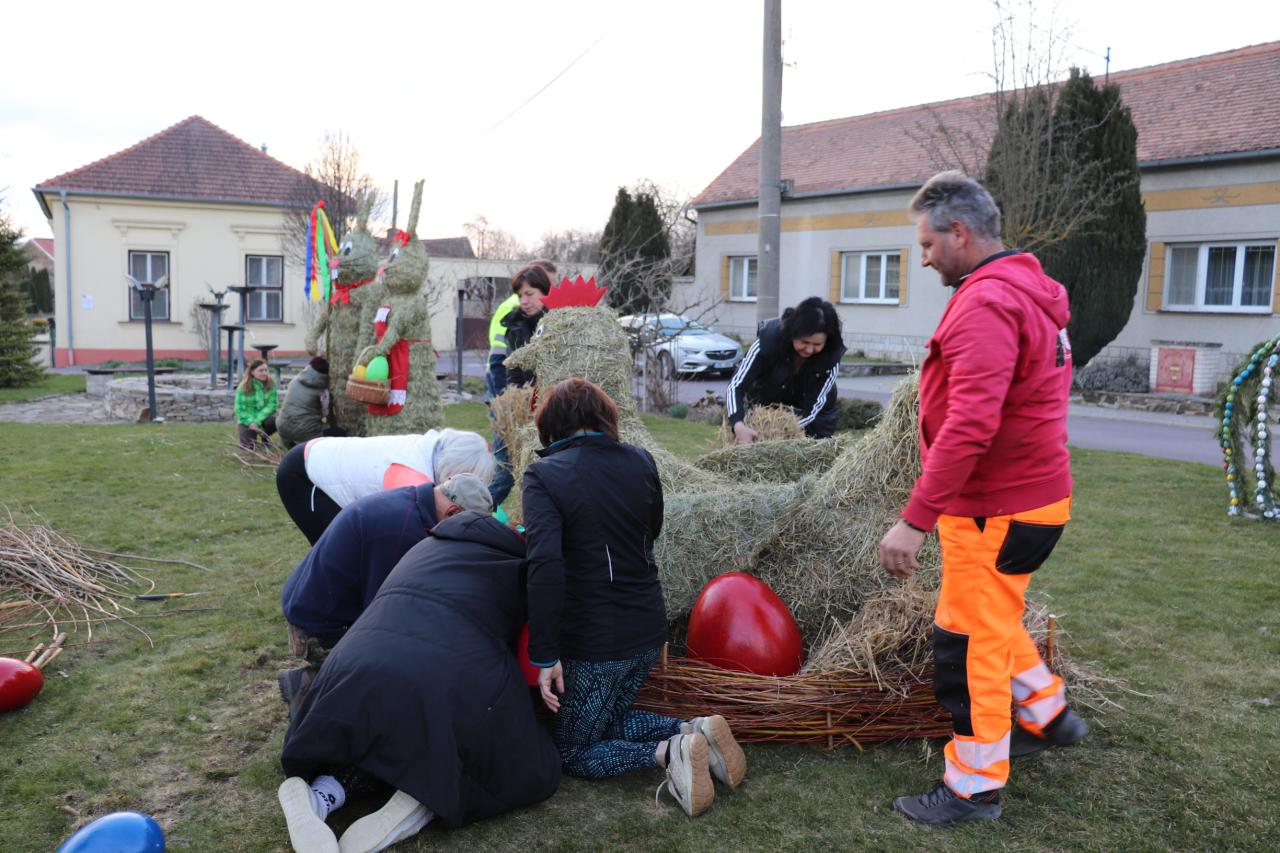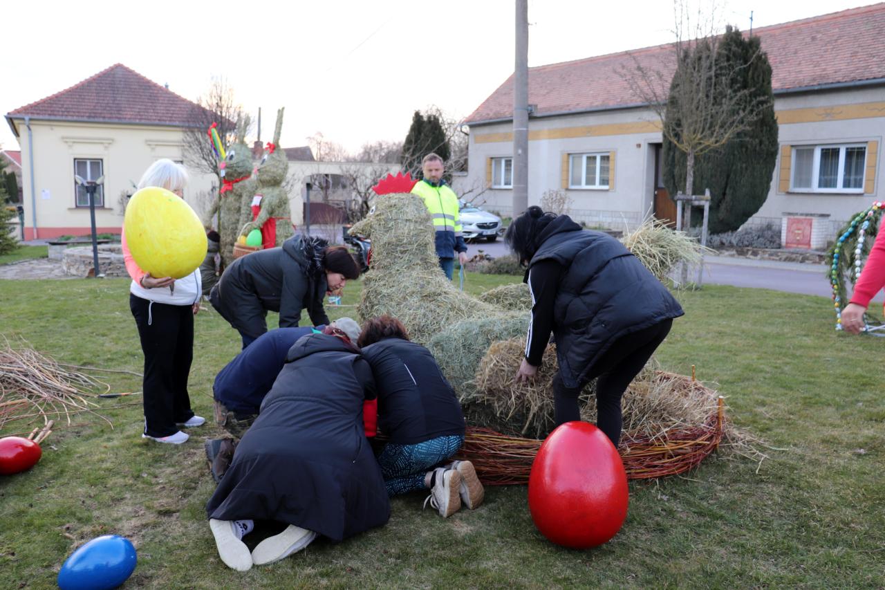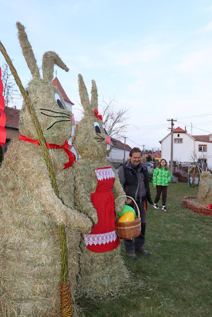 Velikonoční výzdoba na návsi z tvoření ze sena - slepice a králíci ze dne 20. 3. 2026
