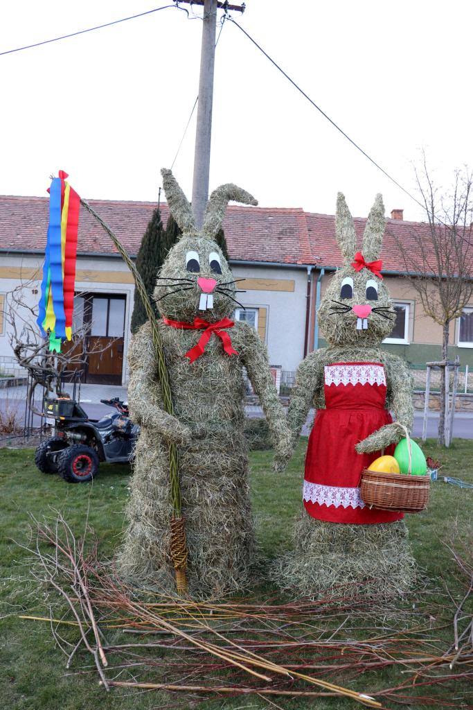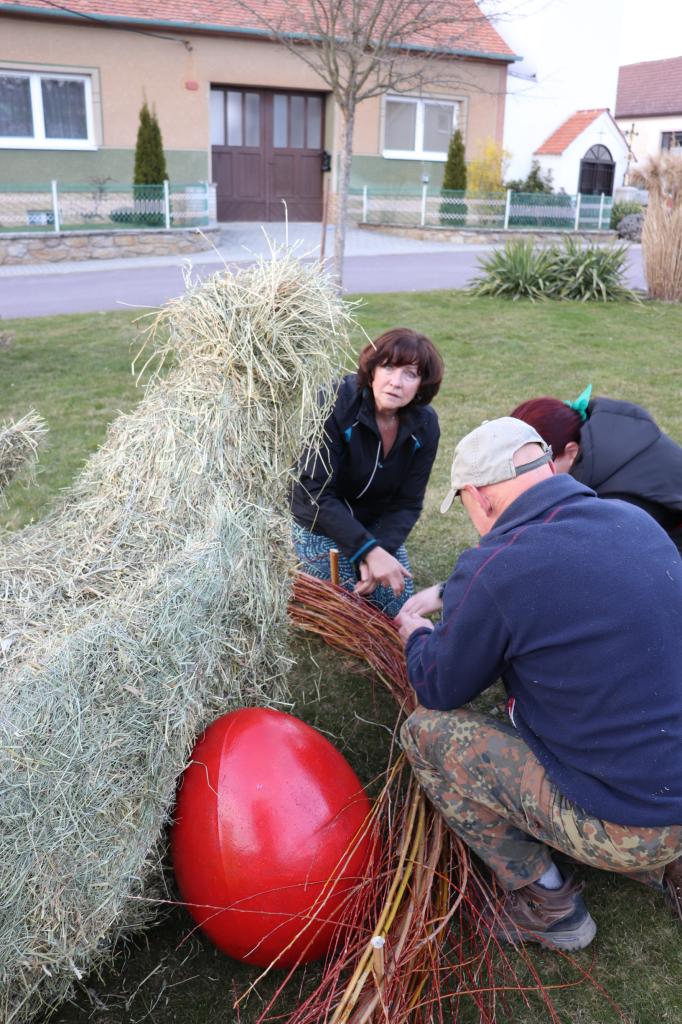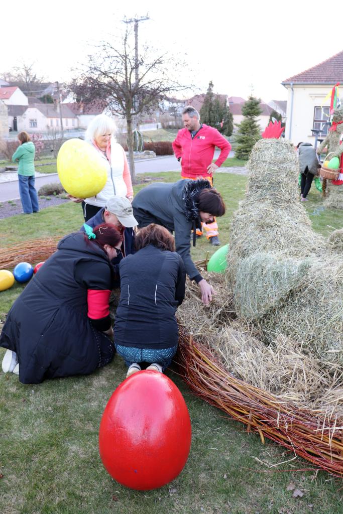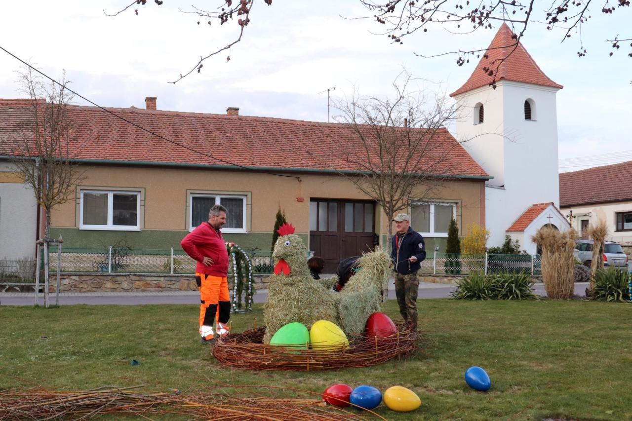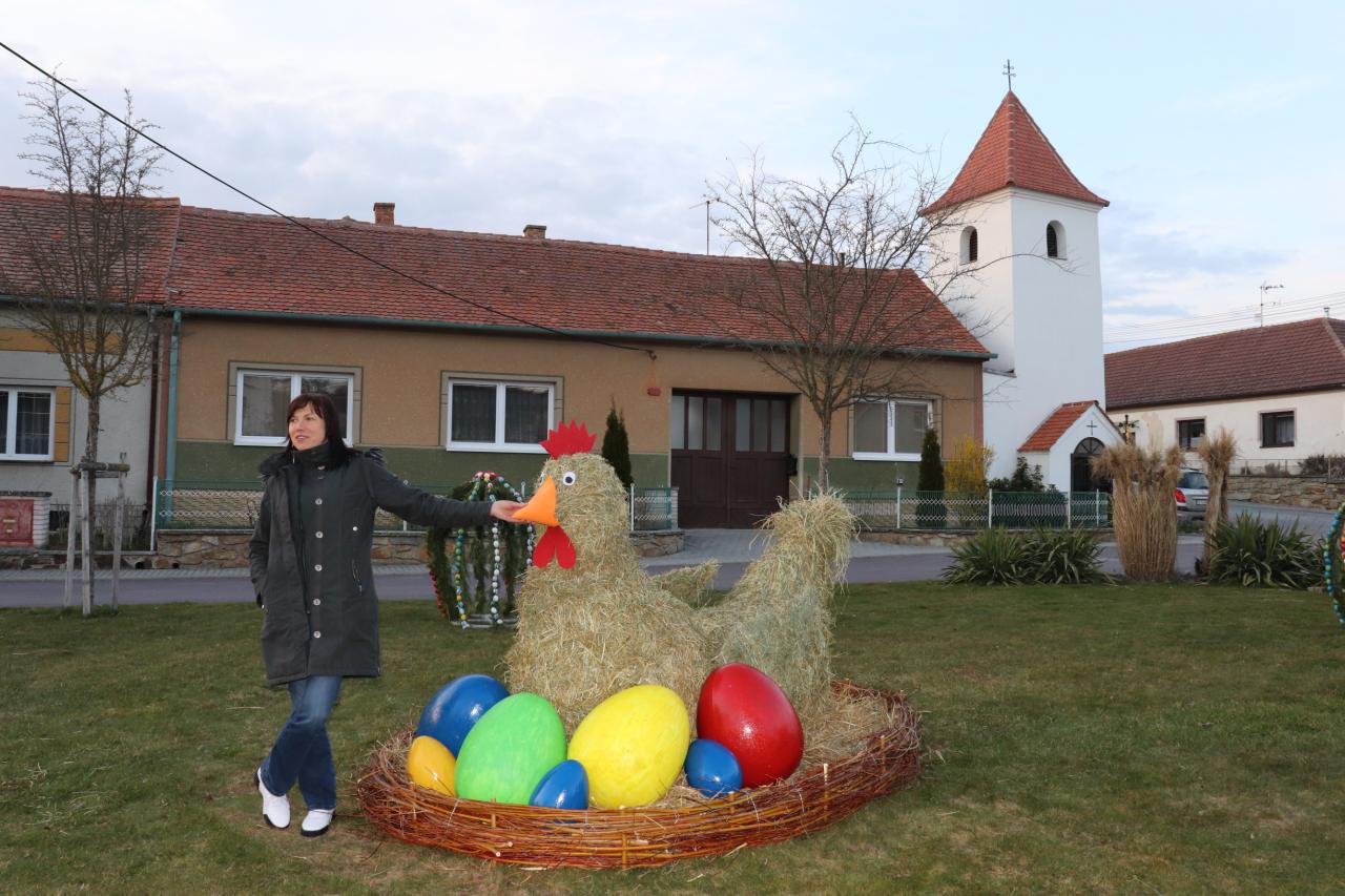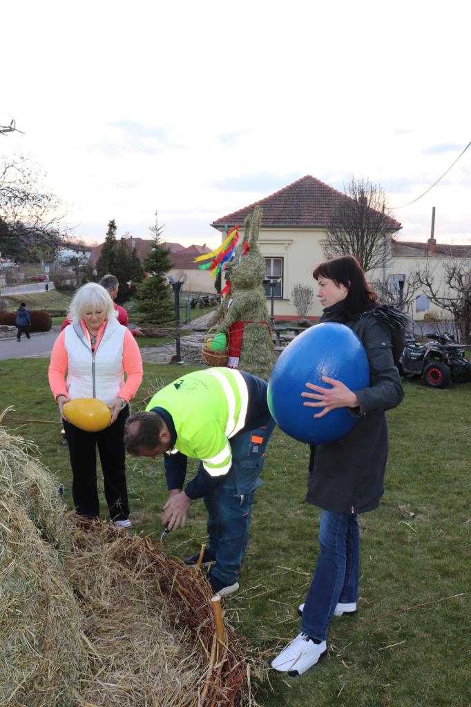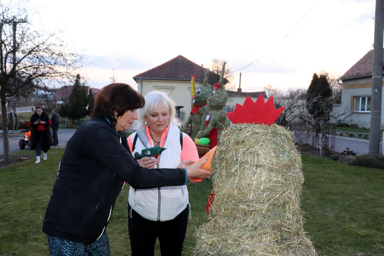 Velikonoční výzdoba na návsi z tvoření ze sena - slepice a králíci ze dne 20. 3. 2026